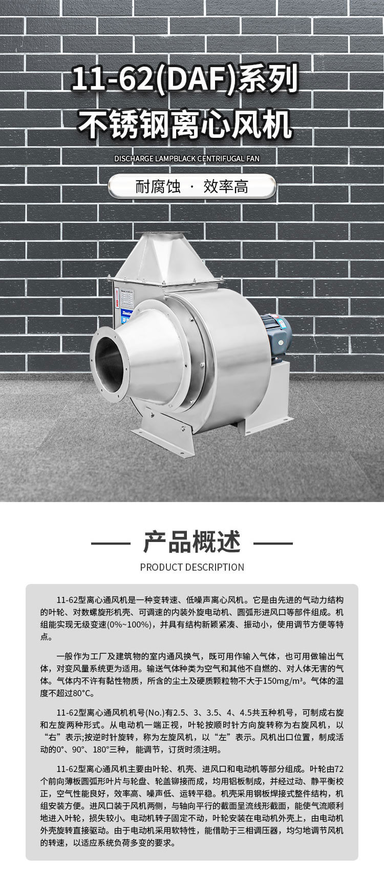 11-62型離心通風(fēng)機(jī)是一種變轉(zhuǎn)速、低噪聲離心風(fēng)機(jī)。它是由先進(jìn)的氣動(dòng)力結(jié)構(gòu)的葉輪、對(duì)數(shù)螺旋形機(jī)殼、可調(diào)速的內(nèi)裝外旋電動(dòng)機(jī)、圓弧形進(jìn)風(fēng)口等部件組成。機(jī)組能實(shí)現(xiàn)無級(jí)變速(0%~ 100%),并具有結(jié)構(gòu)新穎緊湊、振動(dòng)小,使用調(diào)節(jié)方便等特點(diǎn)。