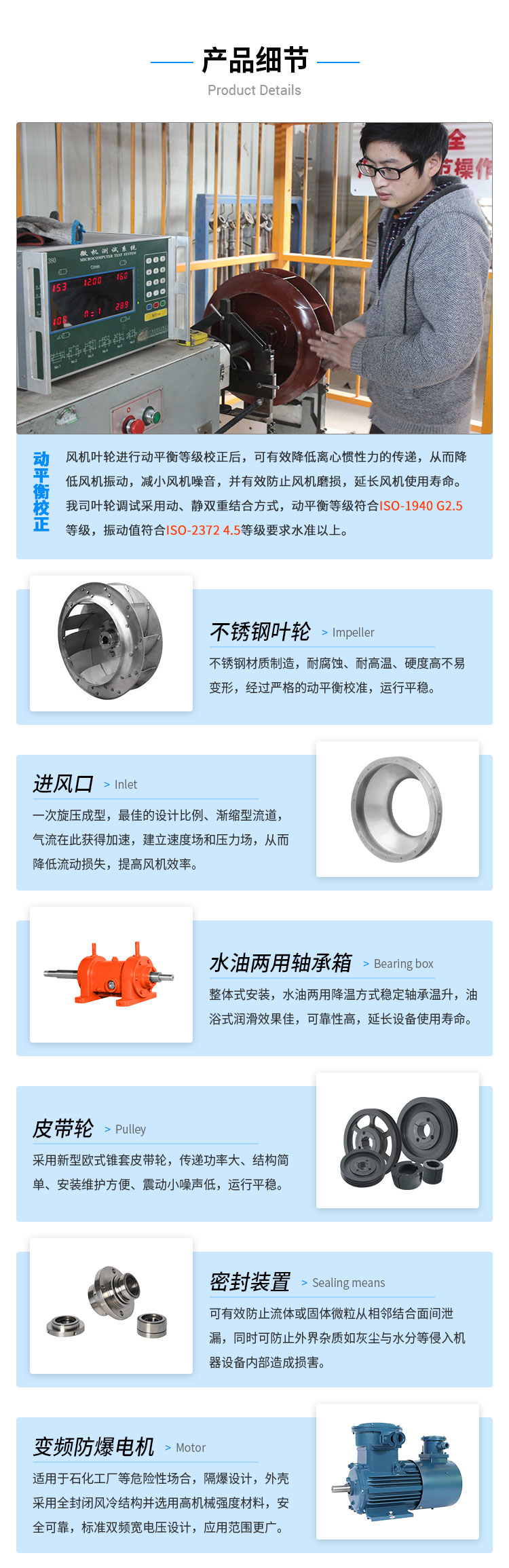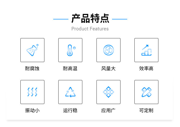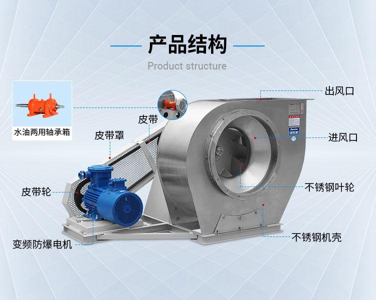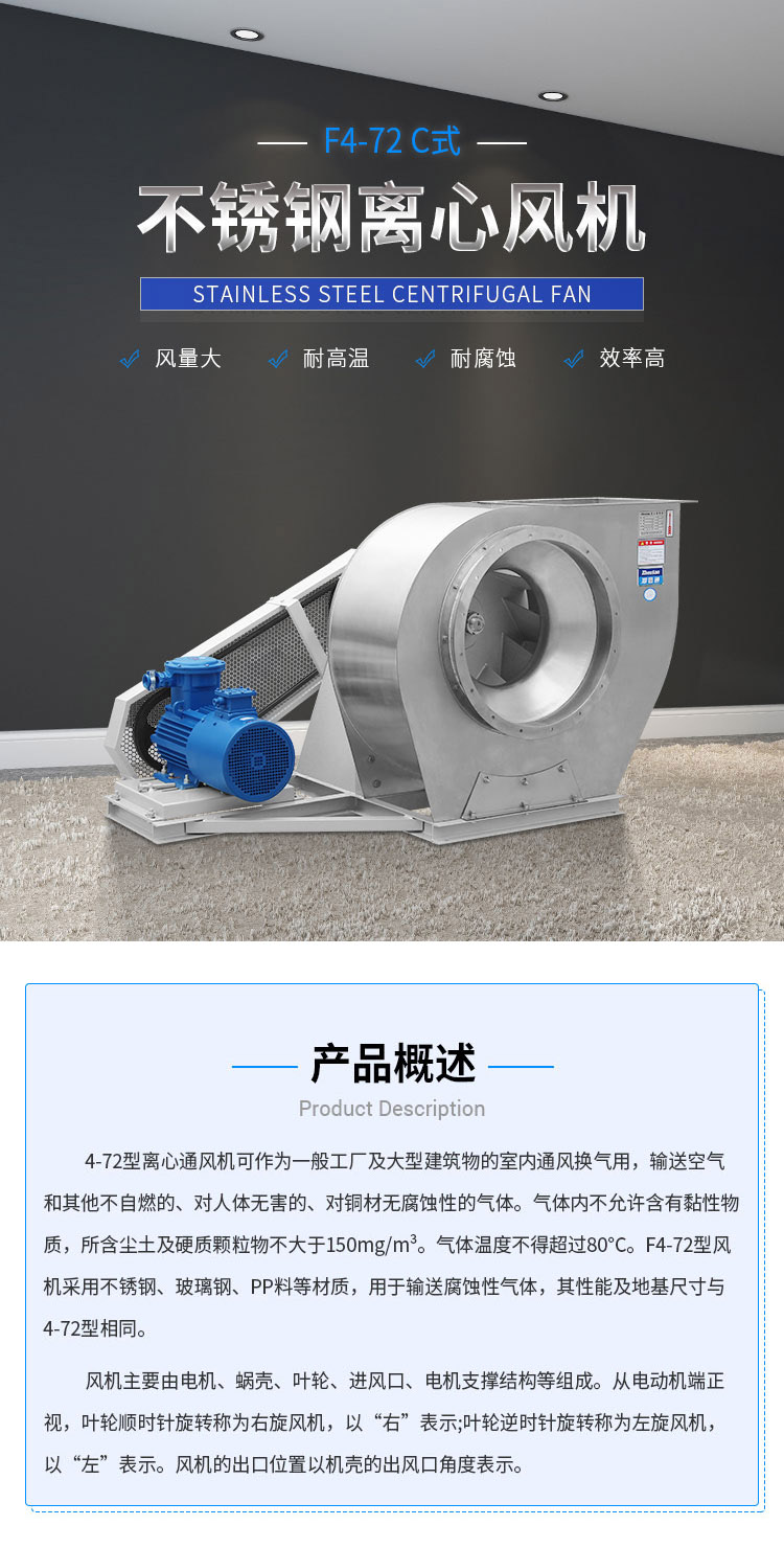 外殼及風輪采用不銹鋼風機材質(zhì)焊接而成,耐高溫,能有效防酸堿、防腐蝕。