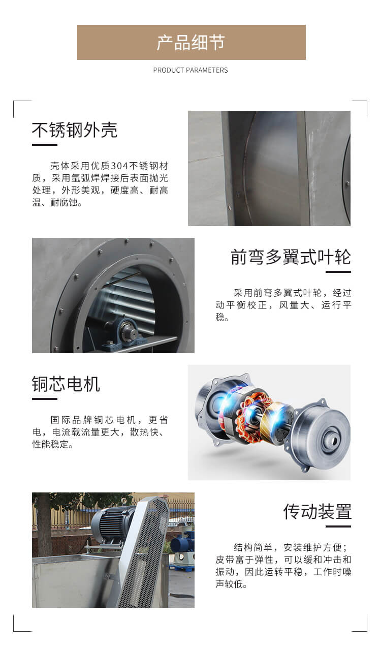 本產(chǎn)品為不銹鋼材質(zhì),具有耐腐蝕、強(qiáng)度高、大風(fēng)量、效率高、安裝方便、經(jīng)久耐用等優(yōu)點(diǎn)。前彎多翼風(fēng)輪,良好的啟動(dòng)性能;可根據(jù)需求定制成電機(jī)直聯(lián)式或皮帶傳動(dòng)式,轉(zhuǎn)速、出風(fēng)角度均可調(diào)節(jié),特殊環(huán)境可定制成防爆等級。根據(jù)客戶具體參數(shù)進(jìn)行量身定制。非標(biāo)定制,國標(biāo)型號均可生產(chǎn)。