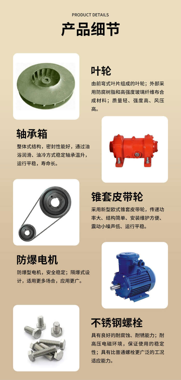 主要由玻璃鋼材質(zhì)制成,大機(jī)號也可以制成皮帶驅(qū)動,耐腐蝕性好、不易老化、噪聲低、重量輕。