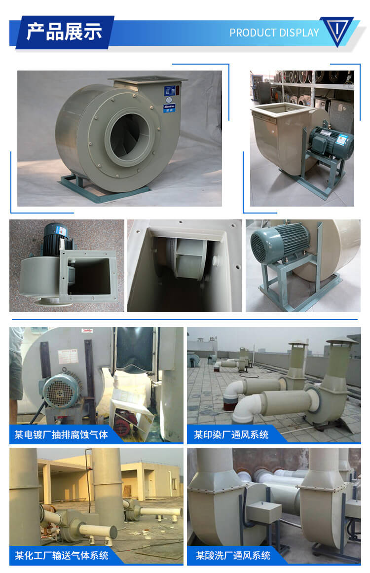 適用于化工、紡織、電鍍、實驗室等場所排送含有一定濃度的酸、堿、鹽等腐蝕性氣體,也可以作為一般工廠的建筑物通風(fēng)換氣用