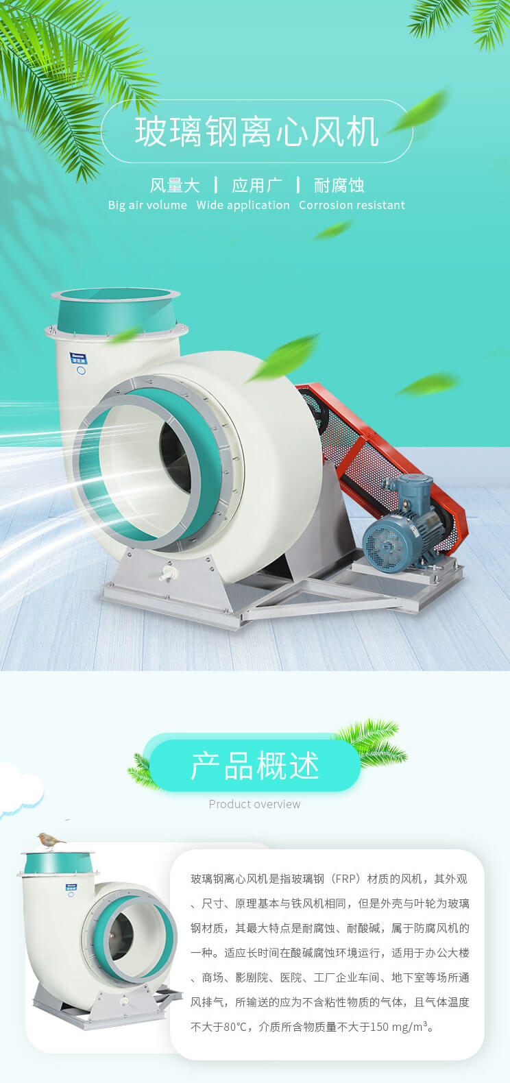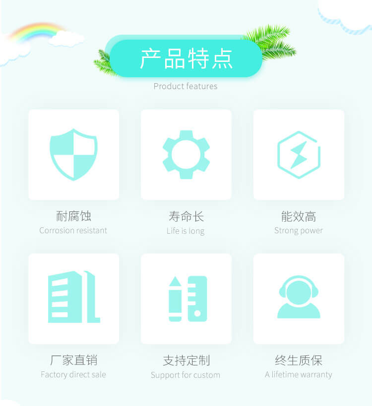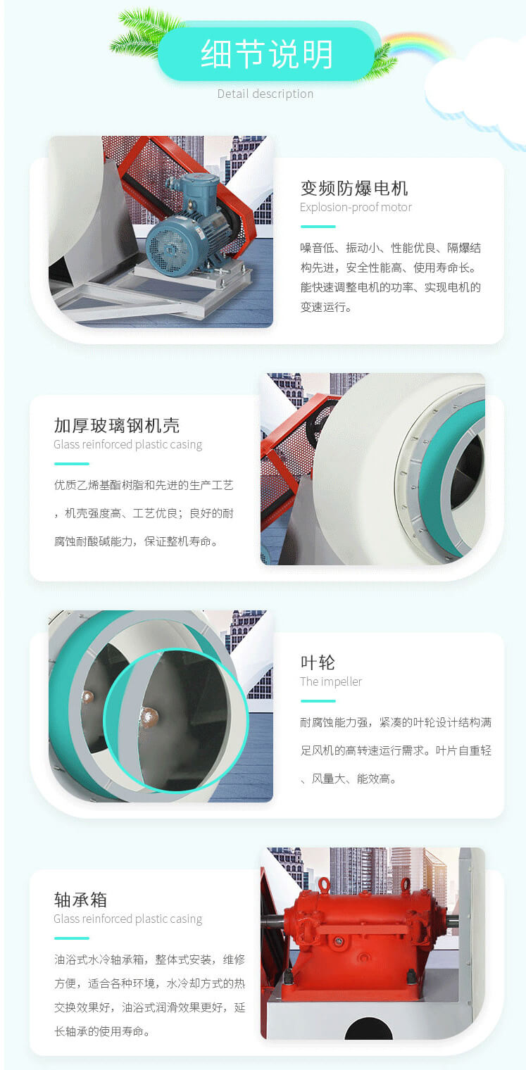 由玻璃鋼材質制成,耐腐蝕性好、不易老化、噪聲低、效率高、重量輕。