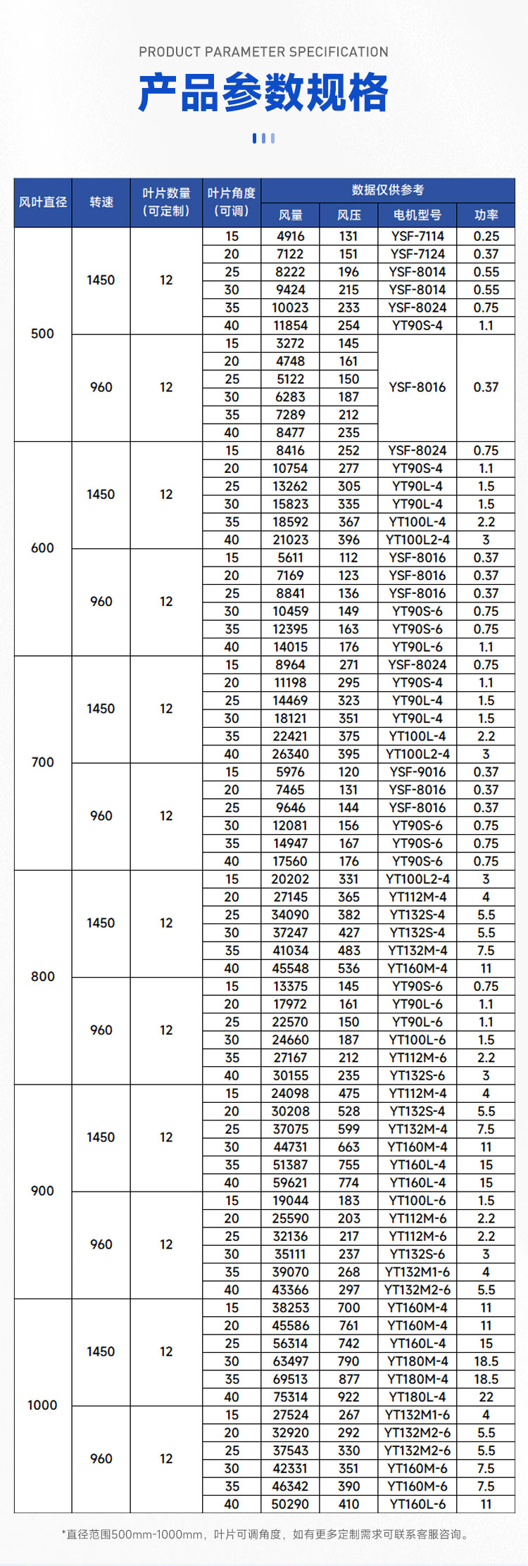 葉片安裝角度可按用戶對(duì)風(fēng)量風(fēng)壓的需求進(jìn)行調(diào)整,