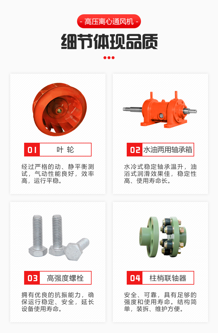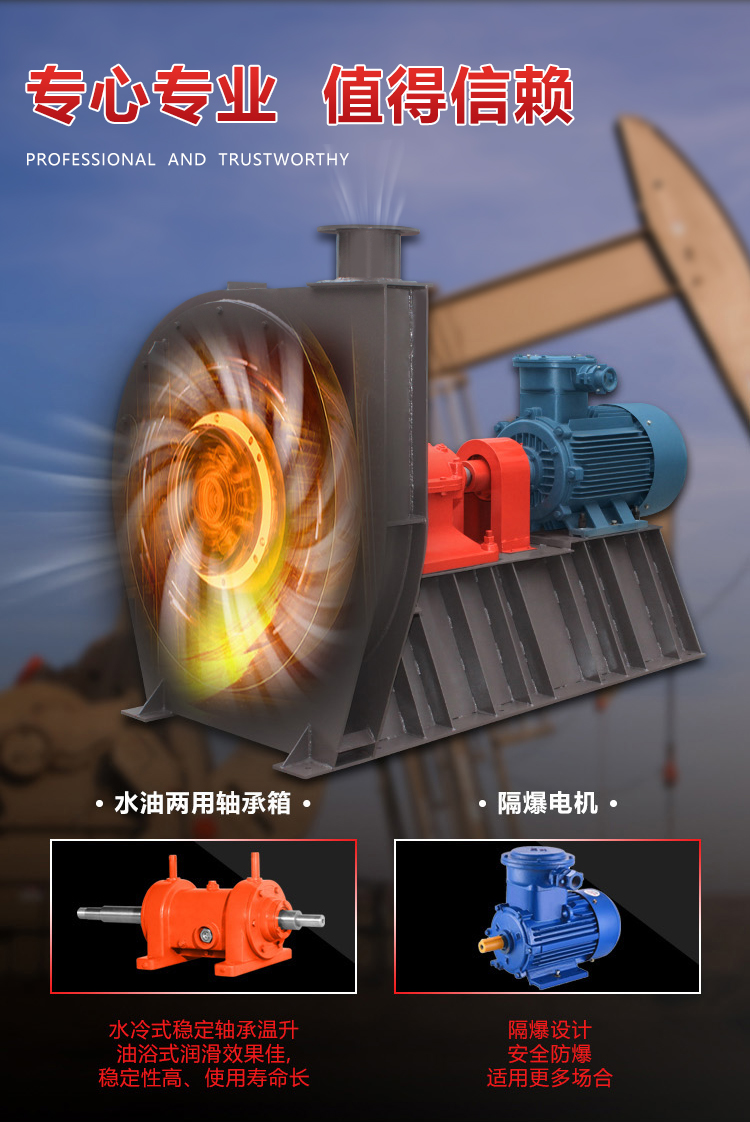 該高壓離心通風(fēng)機(jī)為單吸入式,高壓小流量離心風(fēng)機(jī)。適用于油田、電站、冶金、化工等行業(yè)的高壓強(qiáng)制送風(fēng)。輸送空氣及無腐蝕性不自燃、不含黏性物質(zhì)的氣體。介質(zhì)溫度一般不超過 50°C(最高不超過80°C),介質(zhì)中所含塵土及硬質(zhì)顆粒不大于150mg/m.動平衡等級符合IS0-1940 G2.5等級,振動值符合ISO-2372 4.5等級要求水準(zhǔn)以上。