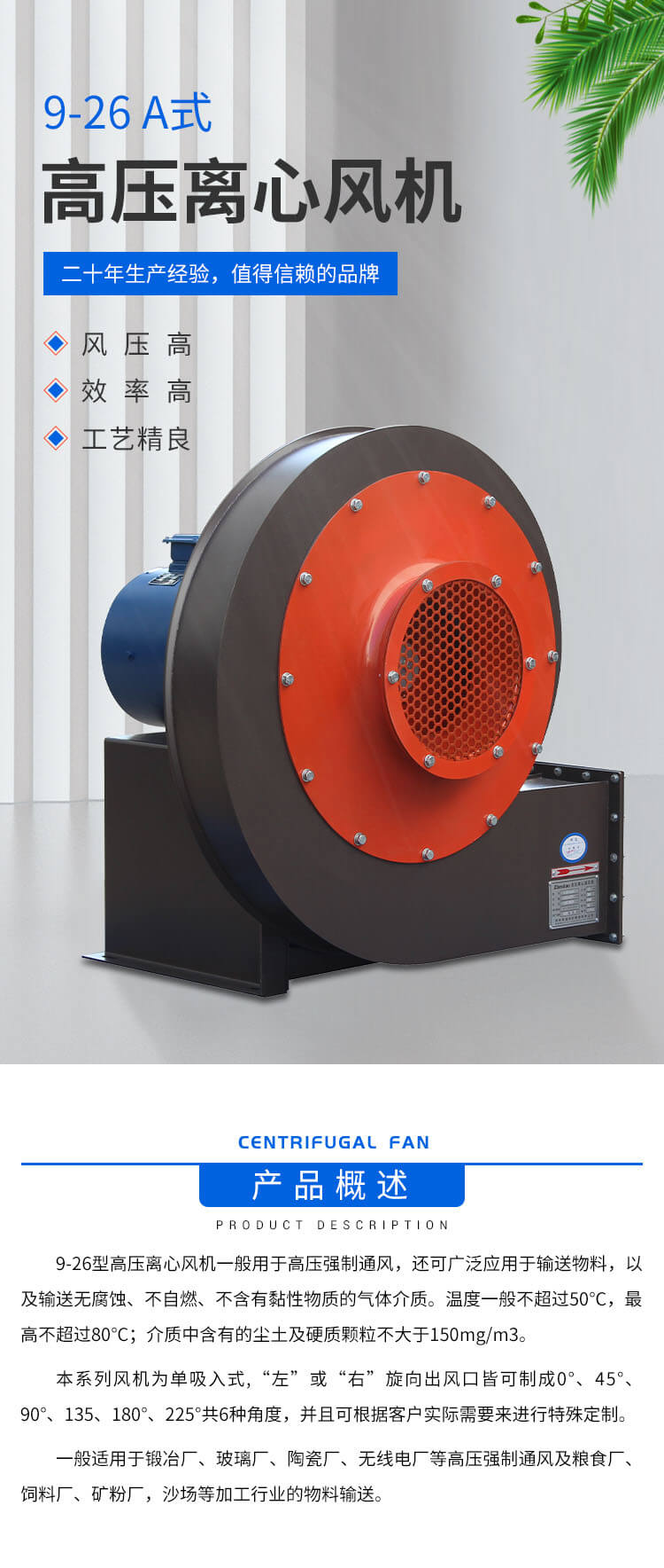9-26系列離心式通風(fēng)機(jī),具有風(fēng)壓高,效率高,效率區(qū)寬,結(jié)構(gòu)緊湊,運(yùn)行可靠等優(yōu)點(diǎn)。廣泛用于高壓強(qiáng)制通風(fēng),如鍛治爐等場(chǎng)合。