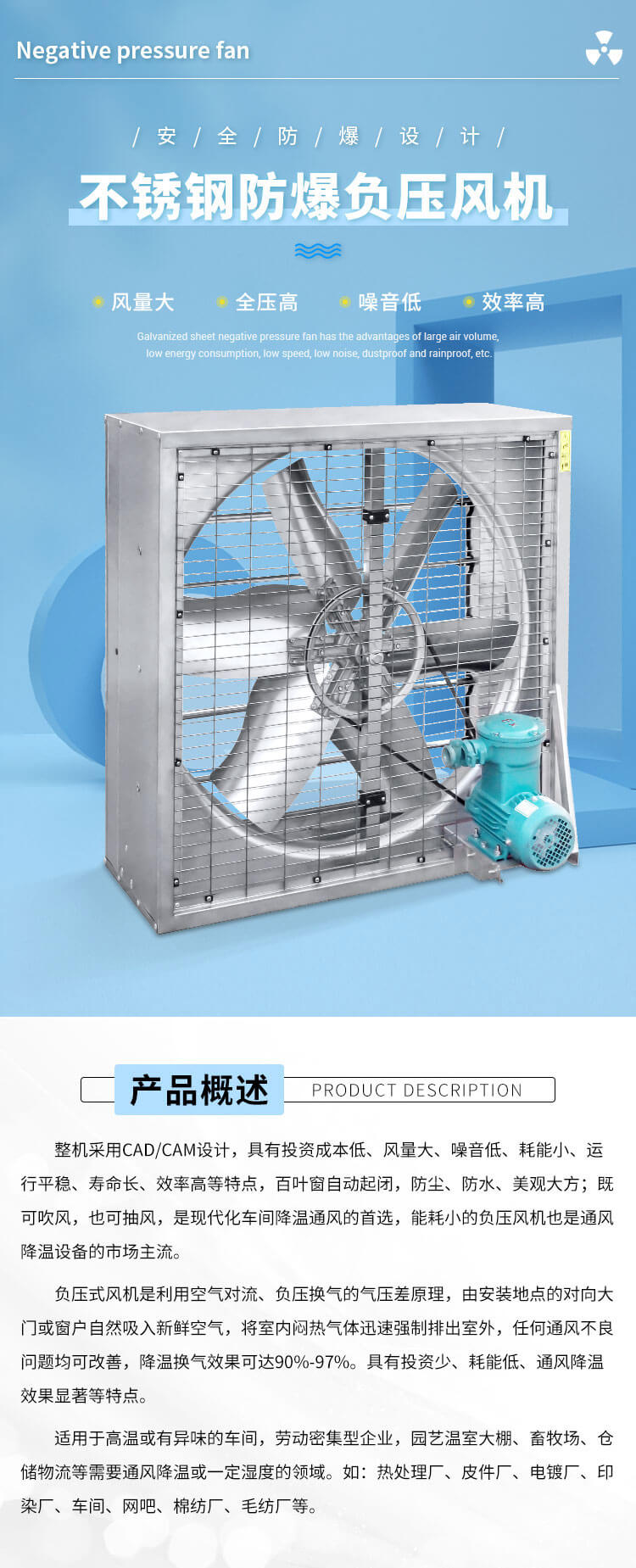 整機(jī)采用CAD/CAM設(shè)計(jì),具有投資成本低、風(fēng)量大、噪音低、耗能小、運(yùn)行平穩(wěn)、壽命長、效率高等特點(diǎn),百葉窗自動(dòng)起閉,防塵、防水、美觀大方;既可吹風(fēng),也可抽風(fēng),是現(xiàn)代化車間降溫通風(fēng)的首選,能耗小的負(fù)壓風(fēng)機(jī)也是通風(fēng)降溫設(shè)備的市場主流。 負(fù)壓式風(fēng)機(jī)是利用空氣對流、負(fù)壓換氣的氣壓差原理,由安裝地點(diǎn)的對向大門或窗戶自然吸入新鮮空氣,將室內(nèi)悶熱氣體迅速強(qiáng)制排出室外,任何通風(fēng)不良問題均可改善,降溫?fù)Q氣效果可達(dá)90%-97%。具有投資少、耗能低、通風(fēng)降溫效果顯著等特點(diǎn)。