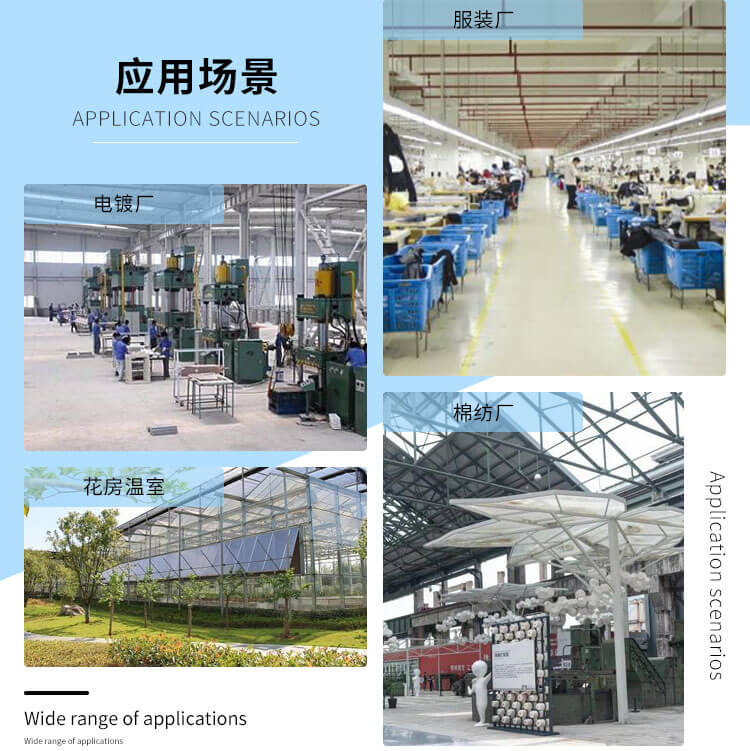適用于高溫或有異味的車間,勞動(dòng)密集型企業(yè),園藝溫室大棚、畜牧場、倉儲物流等需要通風(fēng)降溫或一定濕度的領(lǐng)域,如熱處理廠、皮件廠、電鍍廠、印染廠、車間、網(wǎng)吧、棉紡廠、毛紡廠等。