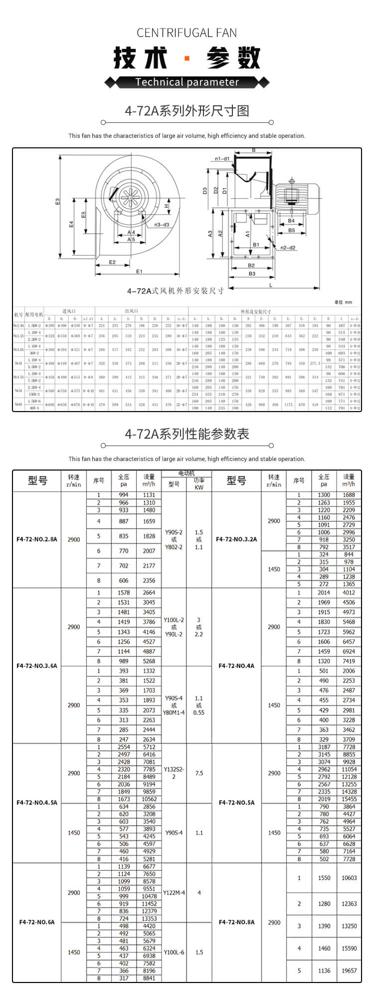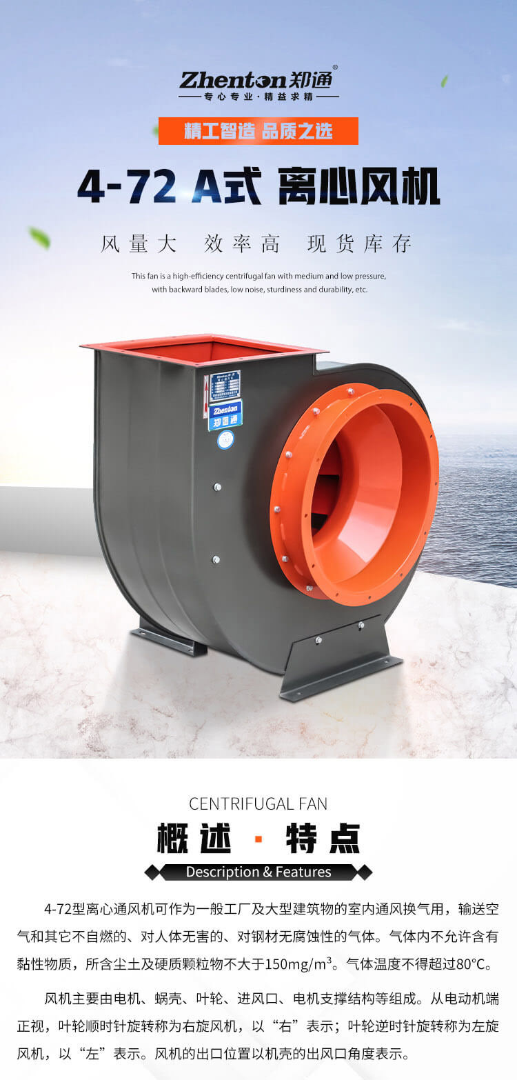 4-72型離心通風機可作為一般工廠及大型建筑物的室內通風換氣用,輸送空氣和其它不自燃的、對人體無害的、對鋼材無腐蝕性的氣體。氣體內不允許含有黏性物質,所含塵土及硬質顆粒物不大于150mg/m3。氣體溫度不得超過80°C。