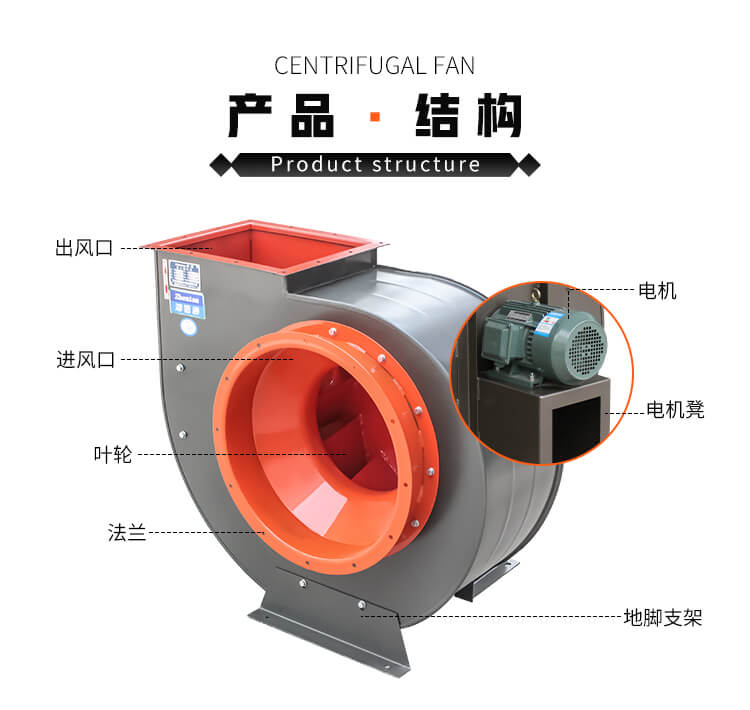 風機主要由電機、蝸殼、葉輪、進風口、電機支撐結構等組成。從電動機端正視,葉輪順時針旋轉稱為右旋風機,以“右”表示;葉輪逆時針旋轉稱為左旋風機,以“左”表示。風機的出口位置以機殼的出風口角度表示。