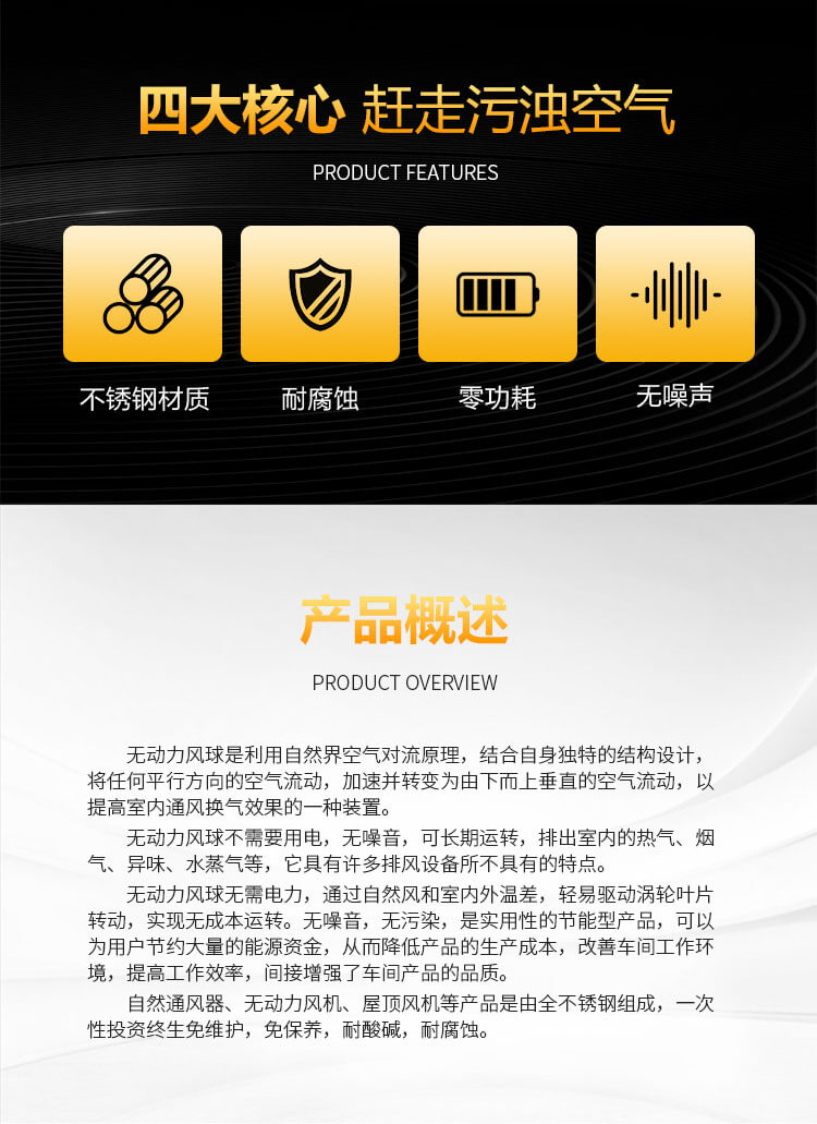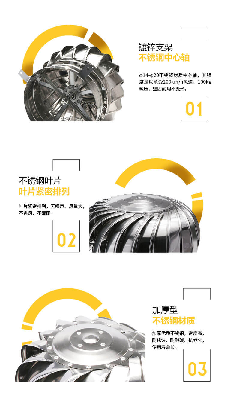 不銹鋼無動力風(fēng)球是利用自然風(fēng)力或室內(nèi)外溫差是指運轉(zhuǎn),能將廠房車間內(nèi)的熱氣、廢氣、油煙、粉塵等有害氣體排出,表面經(jīng)電化處理,耐氧化,耐腐蝕,使用壽命長,免電力、免維修、無噪聲、堅固耐用,防結(jié)露、防雨水。