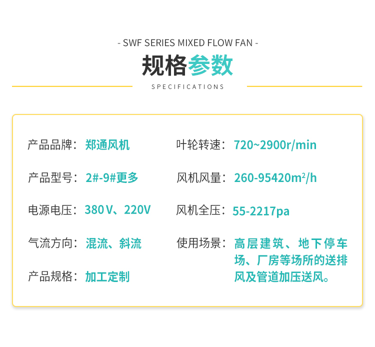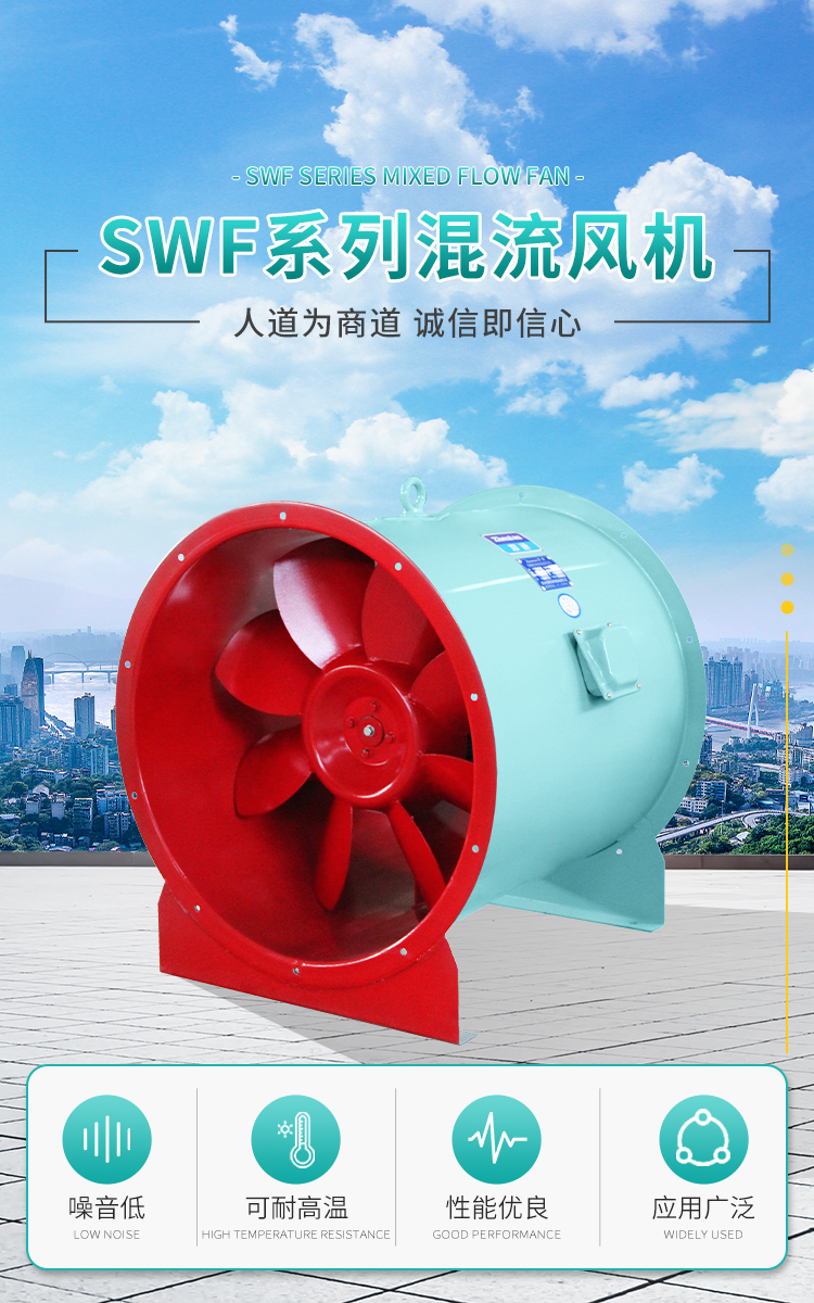 SWF型混流風(fēng)機多用于冷凍、空調(diào)、紡織、船舶、民用建筑等空調(diào)工程通風(fēng)換氣,普通材質(zhì)風(fēng)機可輸送空氣和腐蝕性、不自燃的氣體。
